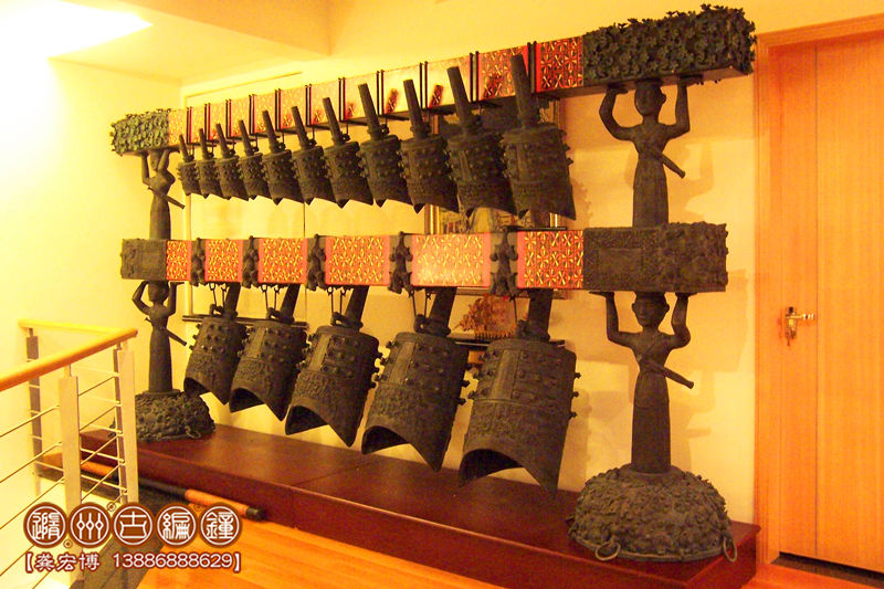特制16件曾侯乙青銅編鐘,是隨州古編鐘公司應(yīng)美國(guó)客戶的要求,按曾侯乙編鐘設(shè)計(jì)制作的一套特制編鐘,編鐘為青銅鑄造,采用國(guó)際標(biāo)準(zhǔn)樂音音高A=440Hz調(diào)音,可以演奏古今中外樂曲,編鐘大梁采用優(yōu)質(zhì)松木制作,表面噴漆,彩繪花紋。編鐘制作完成后,由公司專人專車配送到美國(guó)客戶位于中國(guó)珠海的公司陳列。這位美國(guó)客戶非常喜歡中國(guó)文化,曾多次到公司進(jìn)行考察了解,最終在公司定購(gòu)一套特制16件曾侯乙青銅編鐘。