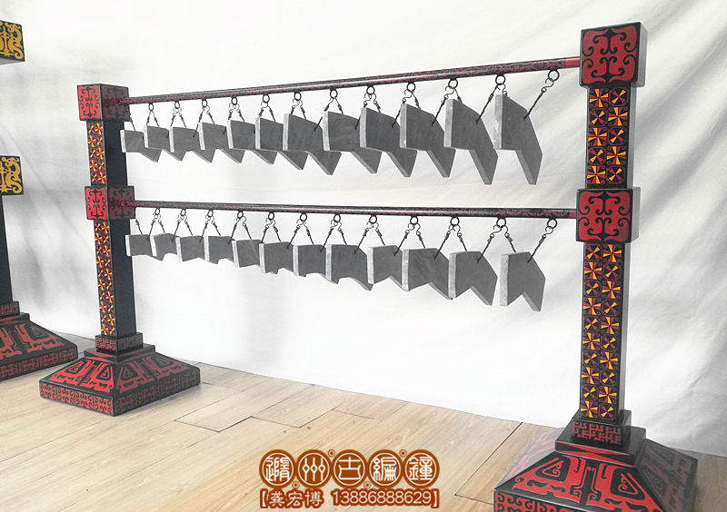 隨州市古編鐘文化發(fā)展有限公司通過考證歷史資料進行研究分析,并八方尋找石源,終于將這套2400多年前的戰(zhàn)國初期大型編磬復(fù)制出來,其發(fā)音與原編磬的標音銘文相符,低音渾厚洪高,高音明澈,音色優(yōu)美而動聽,音域達三個八度,可以旋宮轉(zhuǎn)調(diào),演奏多種樂曲。