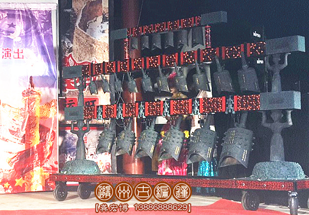 編鐘全部為錫青銅鑄造而成,采用國際標(biāo)準(zhǔn)樂音音高A=440Hz調(diào)音,可以旋宮轉(zhuǎn)調(diào)演奏古今中外樂曲,編鐘大梁采用優(yōu)質(zhì)實(shí)木板制作,表面噴漆,彩繪花紋;另配有保管編鐘用的木箱,便于運(yùn)輸和儲(chǔ)存。編鐘底部可以安裝滑輪系統(tǒng),在舞臺(tái)上方便移動(dòng),2人配合可輕松迅速移動(dòng)到舞臺(tái)合適的位置。