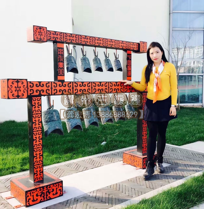 古編鐘公司銷售總經(jīng)理謝女士在編鐘前留影紀念。