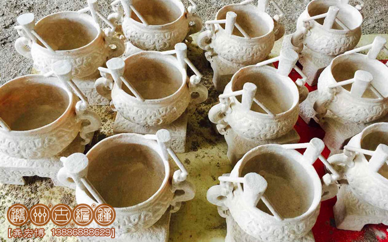 為了保證紋飾的清晰,第一層的面料我們使用硅溶膠進行制作,硅溶膠是一種稀有的貴重精細制作材料,這種材料耐火度非常高,表層變形小,可以得到較好的編鐘表面質(zhì)量。